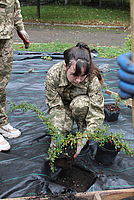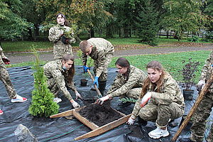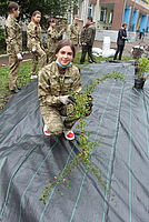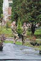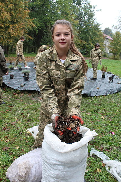 За годину спільної роботи – клумба майже готова. Залишився останній штрих – встелити землю шишками, котрими школярі запаслися заздалегідь.